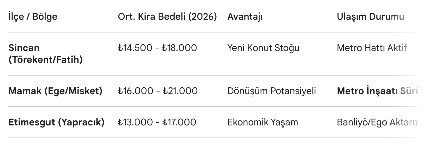 Mamak, 2026 yılının en stratejik bölgesi konumunda. Özellikle Cengizhan Metro İstasyonu ve çevresindeki yol yapım çalışmaları tamamlandığında, bugün "uygun" olarak nitelendirdiğimiz kira bedellerinin Çankaya sınırlarına yaklaşması öngörülüyor.