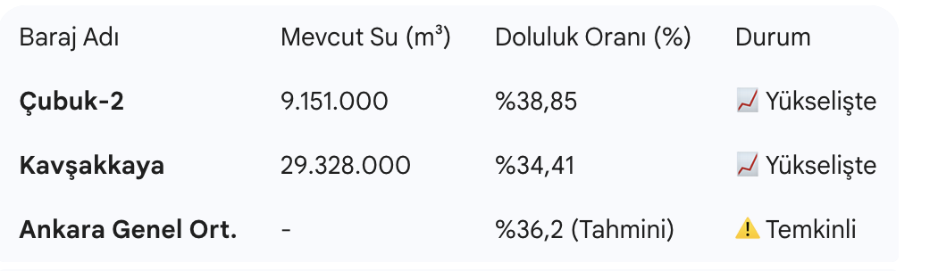 - Doluluk Oranı: %34,41 olarak kayıtlara geçti. Kavşakkaya’daki bu hareketlilik, Ankara’nın toplam su rezervi üzerindeki baskıyı bir nebze olsun hafifletmiş durumda.