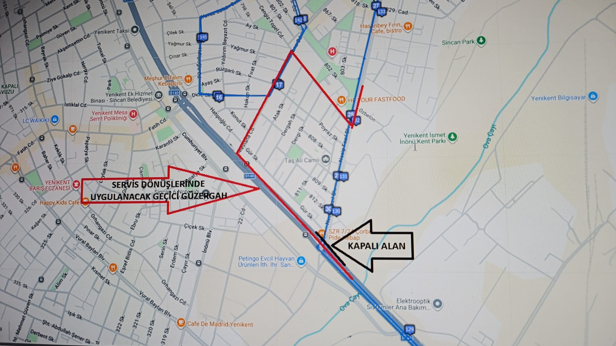 Yapılan resmi açıklamaya göre, özellikle dönüş güzergahında Necip Fazıl Bulvarı'nı kullanan şu hatlar yeni krokideki geçici yolu kullanacak: