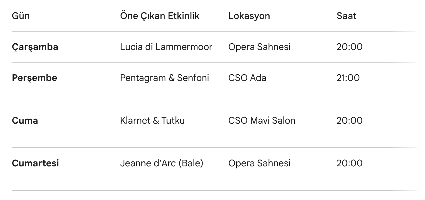 ANKARA (31.03.2026) – Ankara’da bu hafta sonu ve önümüzdeki hafta içi ajandanızda boş yer kalmayacak. Şehrin en prestijli sahneleri olan CSO Ada Ankara, Ankara Opera Sahnesi ve CerModern, uluslararası standartlarda performanslara ev sahipliği yapıyor. Özellikle bazı etkinlikler için biletlerin "son koltuklar" seviyesine geldiği uyarısı yapıldı.