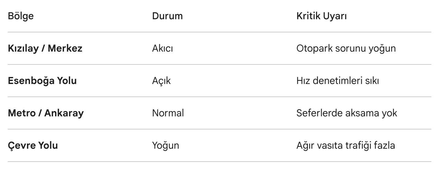 - Samsun Yolu: Kayaş ve Mamak girişlerinde akıcı ama yoğun trafik.