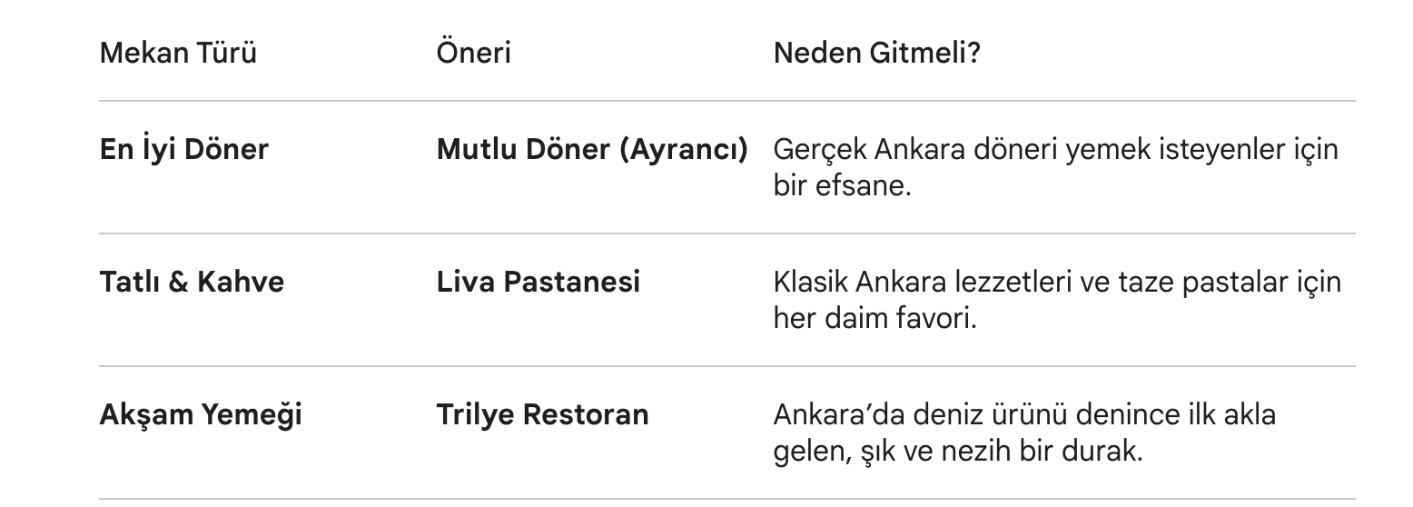- Mekan Önerisi: İncek Sofrası. Özellikle hafta sonu köy kahvaltısı için Ankaralıların gözdesi. (Rezervasyon yaptırmayı unutmayın!)