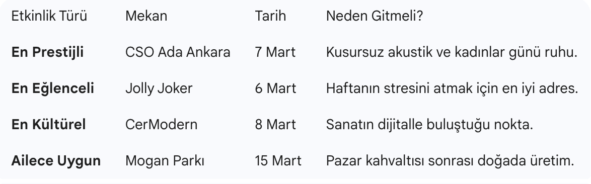 ankarahaberleri.net olarak analizimiz şudur: Ankara'da yaşayanlar için hafta sonu sadece dinlenmek değil, şehrin entelektüel damarlarına bağlanmaktır. 2026 yılında etkinlik biletlerinin hızla tükenmesi, Başkentli’nin sanata olan susuzluğunu gösteriyor. Özellikle CSO Ada çevresindeki yeni restoranlar ve Tunalı’daki butik kafelerle birleşen etkinlik rotaları, "yaşayan bir Ankara" imajını perçinliyor.