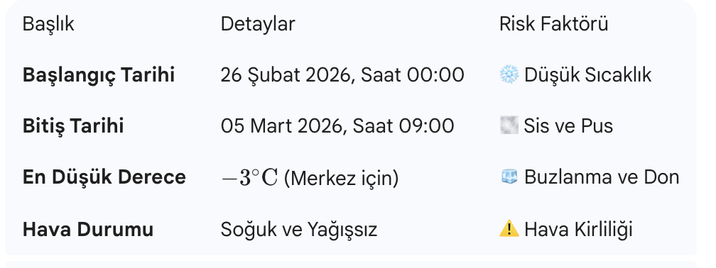 ANKARA – Ankara Valiliği, Meteoroloji Genel Müdürlüğü’nün son verileri ışığında Başkent genelini kapsayan geniş çaplı bir "Meteorolojik Uyarı" yayınladı. 27 Şubat Cuma gününden itibaren etkisini gösterecek olan soğuk hava dalgası, yağışsız ancak dondurucu bir atmosferi beraberinde getiriyor.