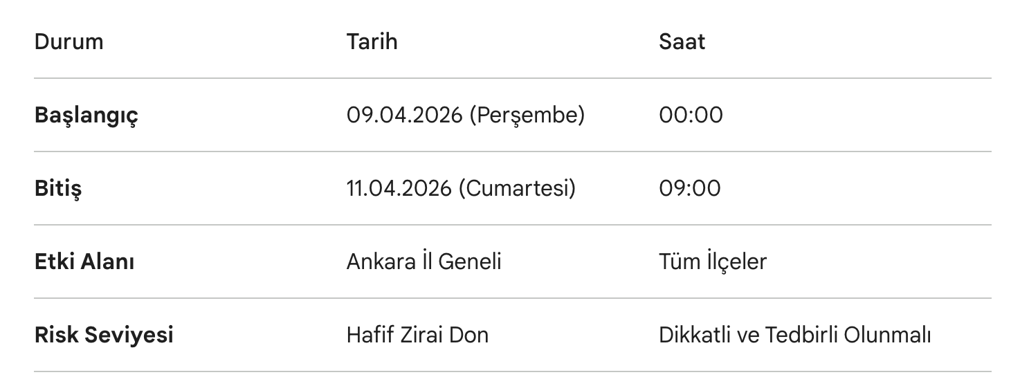 ankarahaberleri.net tarım ve yaşam masası analizimiz: Ankara’nın Nisan ayı her zaman sürprizlere gebedir. Gündüz güneşine aldanıp bahçesini eken veya saksılarını dışarı çıkaran vatandaşlarımızın, bu 72 saatlik süreçte bitkilerini koruma altına alması hayati önem taşıyor. Özellikle Haymana, Polatlı ve Çubuk gibi tarım bölgelerinde üreticilerimizin dumanlama veya yağmurlama gibi don önleme yöntemlerini hazırda tutması gerekebilir.