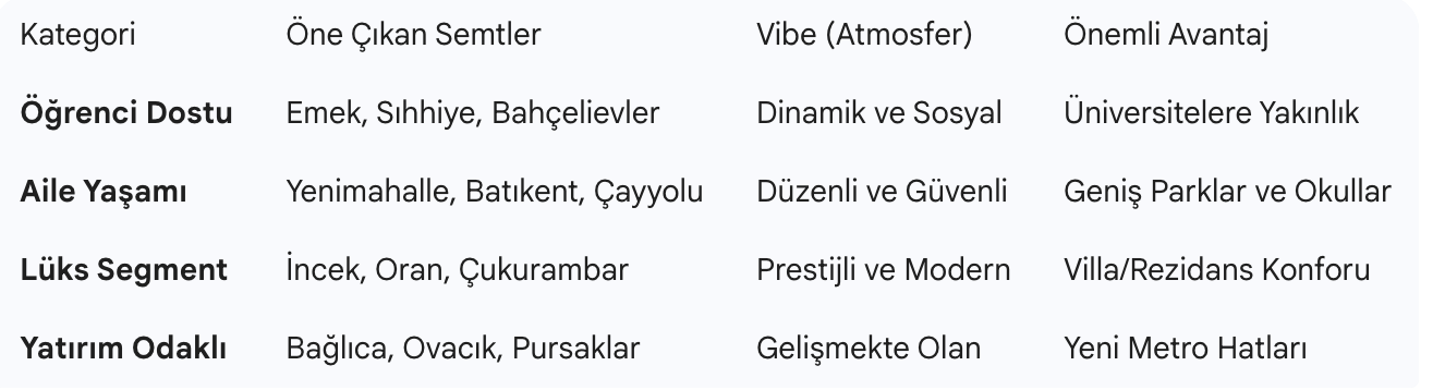 - İncek: Ankara’nın "villa cenneti". Geniş bahçeli evler, özel okullar ve düşük nüfus yoğunluğuyla lüks yaşamın yeni adresi.