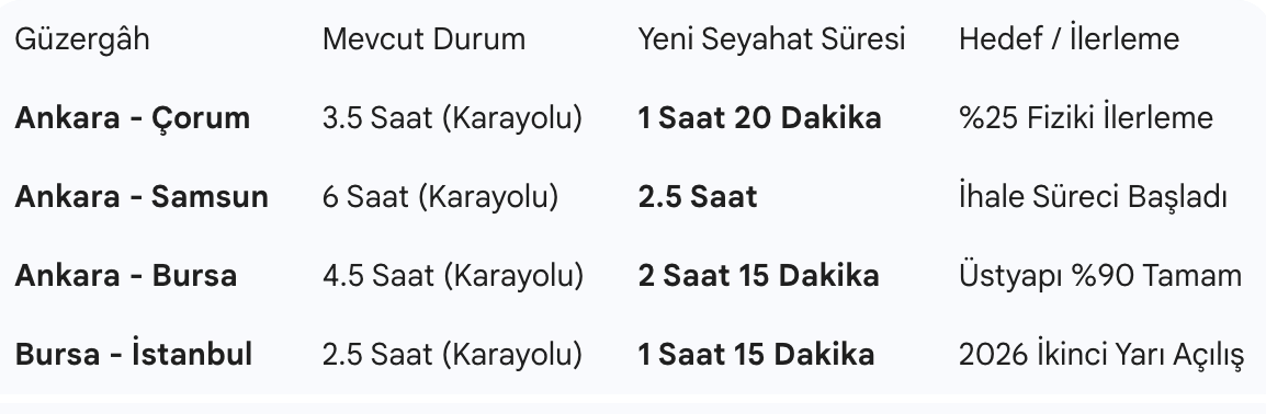- Samsun 2,5 Saat: Projenin tamamlanmasıyla Ankara’dan binen bir yolcu, sabah kahvaltısını Başkent’te yapıp öğle yemeğinde Samsun sahiline inebilecek (Seyahat süresi: 2,5 saat).