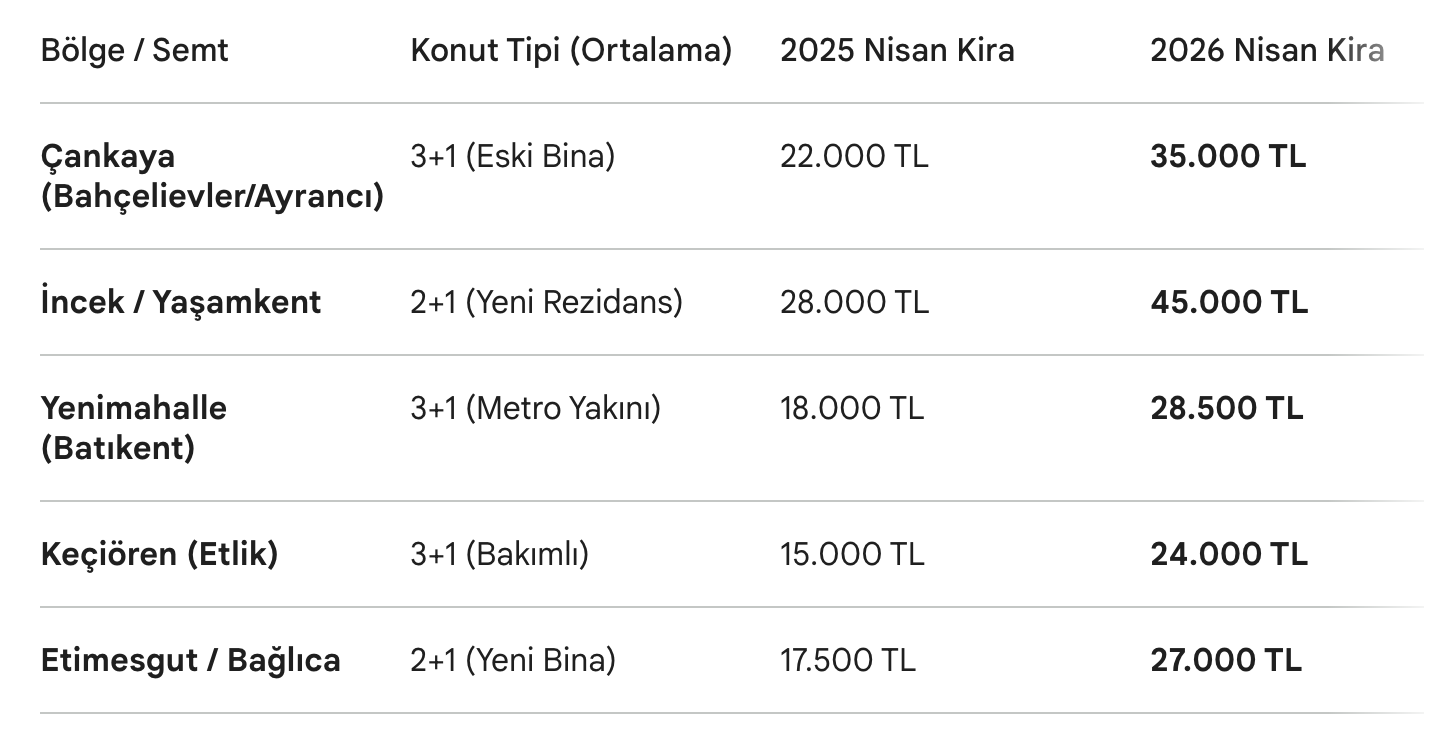 Ankara’nın kira piyasası artık tek bir blok değil; "ulaşım odaklı" ve "prestij odaklı" olarak ikiye ayrılmış durumda. İşte 2026 Nisan ayı itibarıyla semtlerdeki ortalama durum: