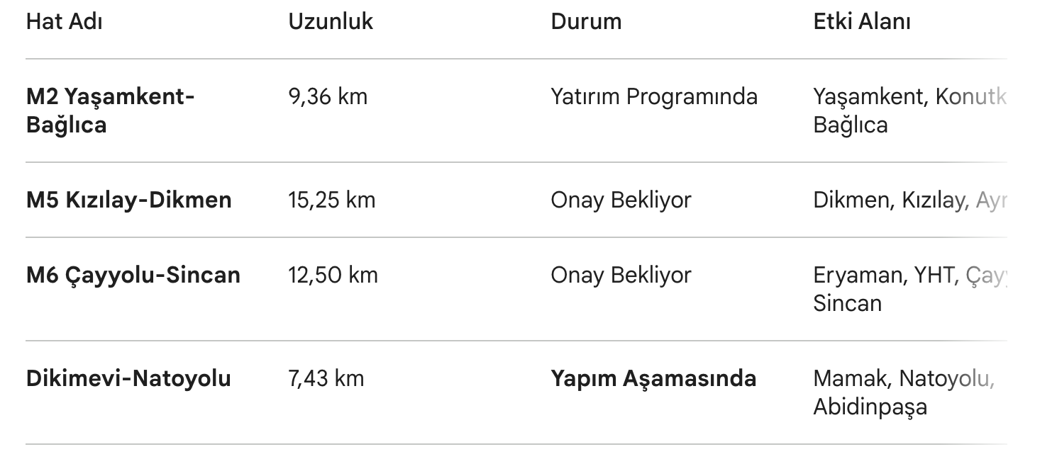 📊 Ankara Yeni Metro Hatları Karşılaştırma Tablosu