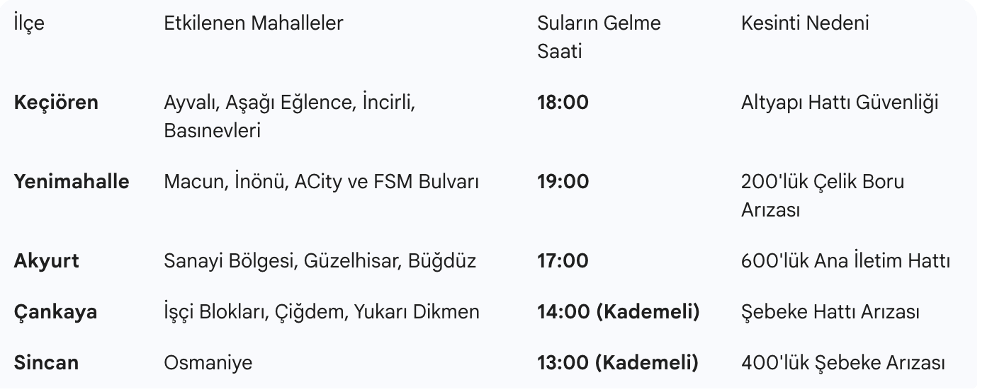 - YENİMAHALLE: ACity çevresi, Macun Mahallesi ve FSM Bulvarı üzerindeki sanayi bölgelerinde çelik boru arızası nedeniyle kesintinin saat 19:00’a kadar sürmesi bekleniyor.