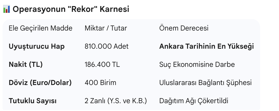 ankarahaberleri.net asayiş masası olarak altını çiziyoruz: Bu rakam sadece istatistik değil. 810 bin hapın sokaklara dağılması, Ankara’nın her mahallesinde, her okul önünde yaşanabilecek binlerce trajedinin fitilini ateşleyecekti. Narkotik ekiplerinin bir ay süren sabırlı takibi, Başkent’in geleceğine kasteden dev bir organizasyonu imha etti. Ankara polisi, 2026 yılında da "sıfır tolerans" ilkesiyle zehir tacirlerinin kabusu olmaya devam ediyor.