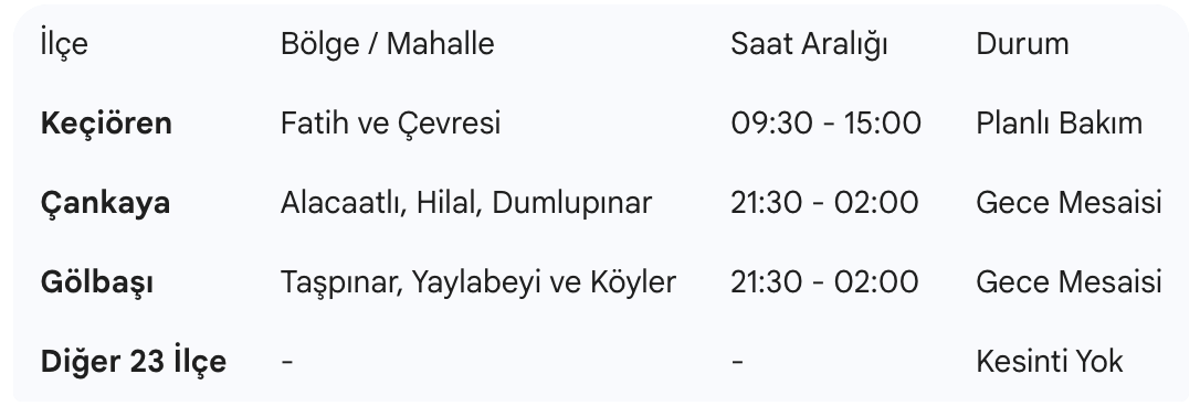 - Şarj Durumu: Özellikle Çankaya/Gölbaşı hattındaki gece kesintisi öncesi telefon ve laptop gibi cihazlarınızın şarjını %100’e getirin.