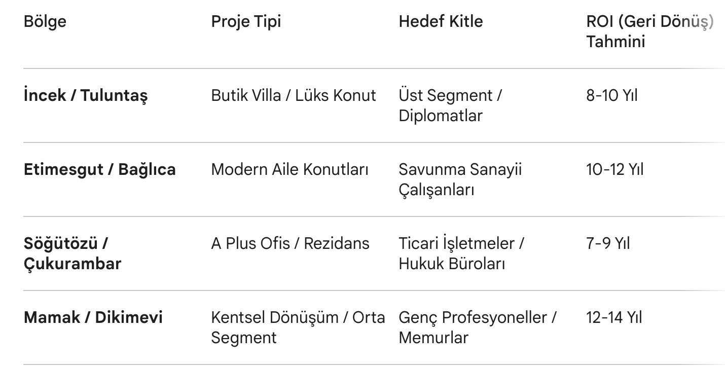 - Yatırımcı Analizi: Gölbaşı-İncek hattı, Ankara’da arsa değerleme hızının en yüksek olduğu bölge. Burada butik villa projeleri ve geniş sosyal donatılı siteler, uzun vadeli kiracı profilinde "Uluslararası Diplomasi ve Akademik Kadro"yu hedefliyor.
