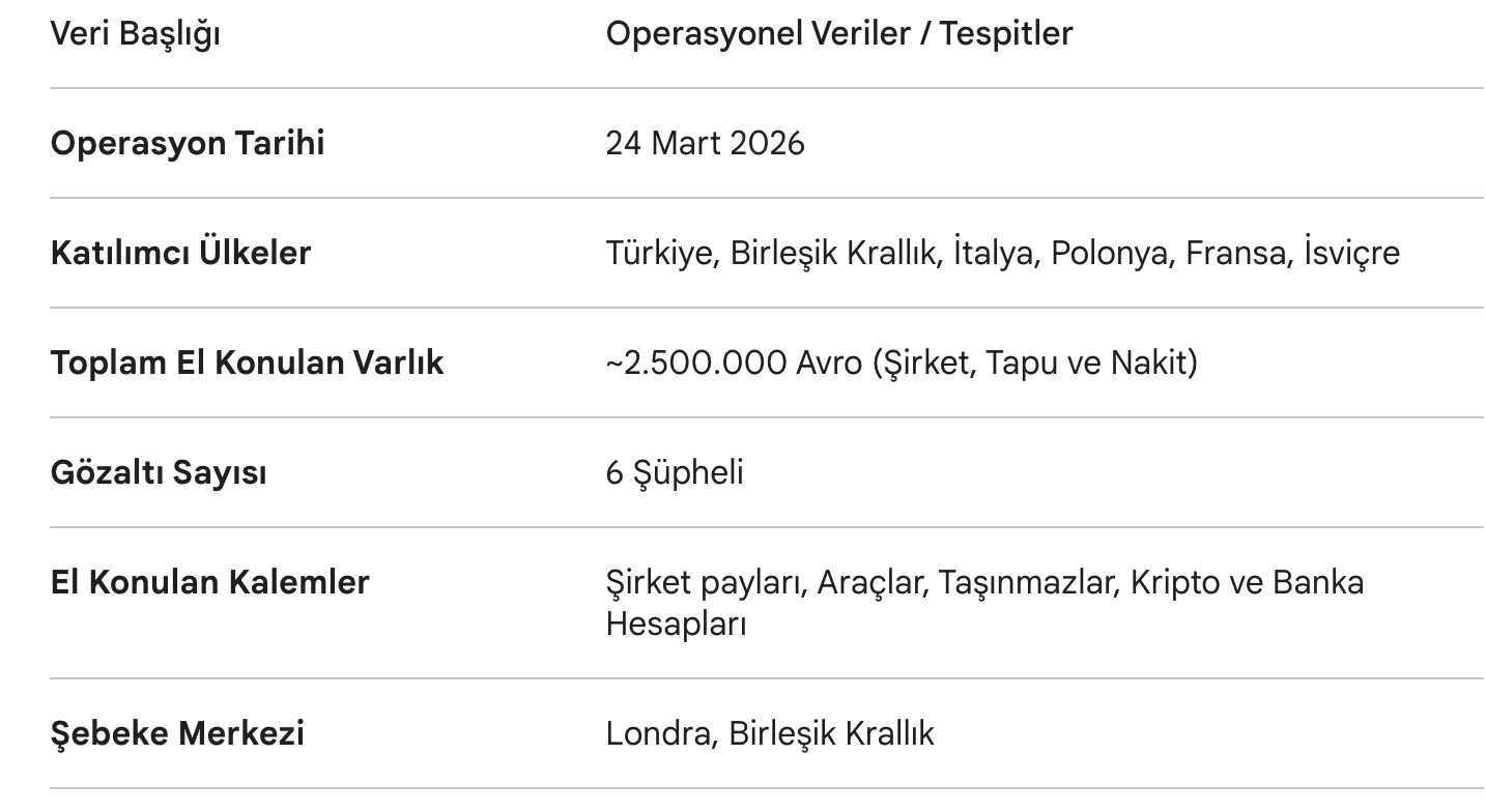 ANKARA (31.03.2026) – Ankara Cumhuriyet Başsavcılığı Suçtan Kaynaklanan Mal Varlığı Değerlerinin Aklanması Bürosu, sınır ötesi bir operasyonla "kara para" ekosistemine neşter vurdu. 24 Mart 2026 tarihinde, Ankara merkezli koordinasyonla İtalya, Polonya, Fransa, Birleşik Krallık ve İsviçre kolluk kuvvetleri eş zamanlı olarak düğmeye bastı. Hedefte; Londra merkezli yönetilen ve Baybaşin suç örgütünün finansal damarı olan devasa bir yapı vardı.