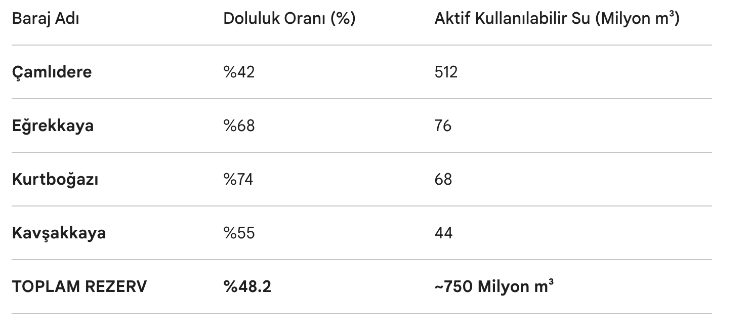 Ankara’nın su ihtiyacını karşılayan Çamlıdere, Eğrekkaya ve Kurtboğazı barajlarında toplam doluluk oranı, Nisan ayı itibarıyla %48 seviyesine ulaştı. Geçen yılın aynı dönemine göre %10’luk bir artış gözlense de uzmanlar uyarıyor: "Ölü hacim" çıkarıldığında Ankara'nın elinde yaklaşık 220 günlük su rezervi bulunuyor. Bu da hiç yağış almasak bile kış başına kadar suyun yeteceği anlamına geliyor.