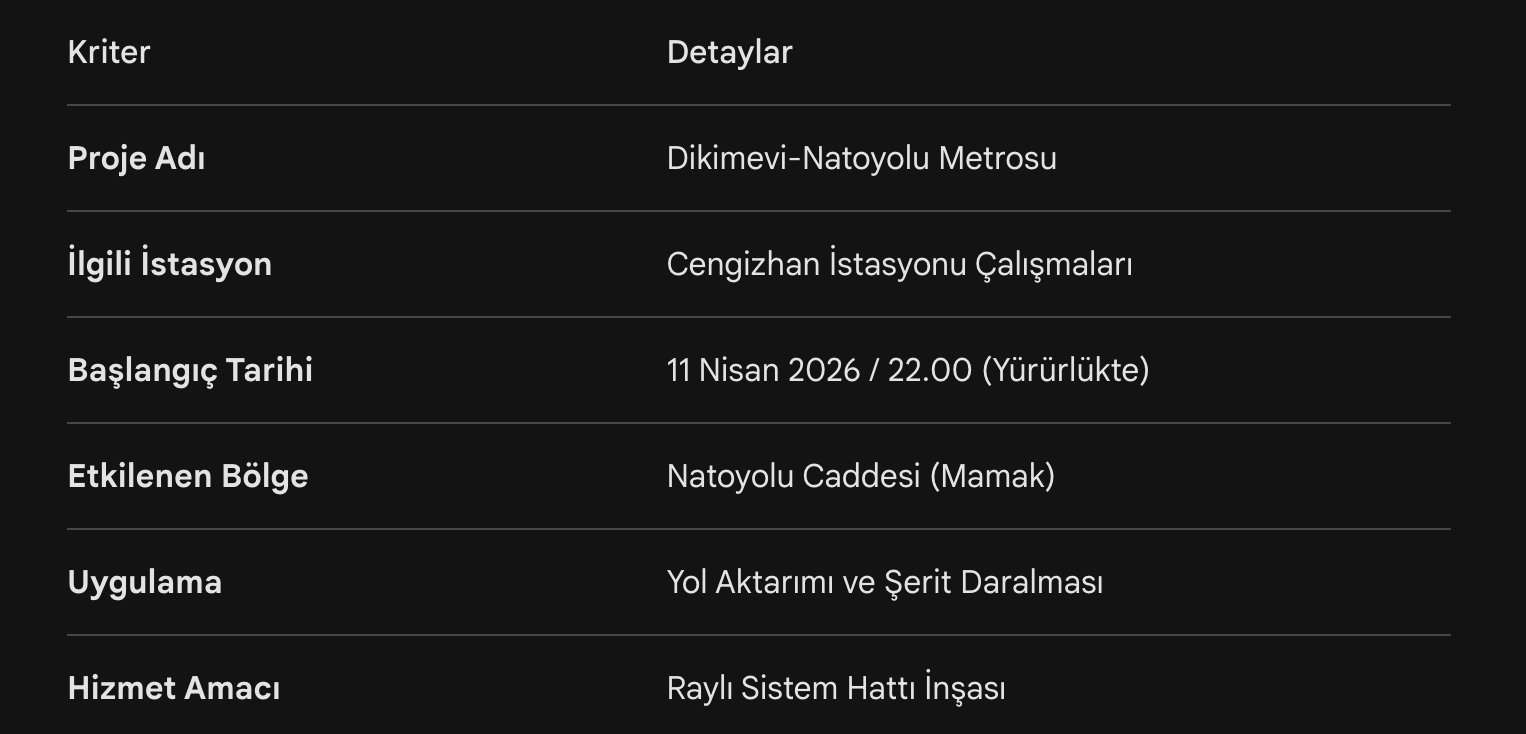 ankarahaberleri.net ulaşım masası analizimiz: Mamak bölgesinin yıllardır beklediği raylı sistem projesinde fiziki çalışmaların cadde üzerine taşması, projenin "görünür" hale geldiğinin en büyük kanıtı. Ancak Natoyolu Caddesi, bölgenin ana damarı konumunda olduğu için bu daralma özellikle toplu taşıma ve özel araç trafiğinde ciddi yavaşlamalara neden olacaktır. Okurlarımızın seyahat sürelerine en az 15-20 dakikalık ekleme yapmaları ve navigasyon uygulamalarını güncel takip etmeleri önerilir.