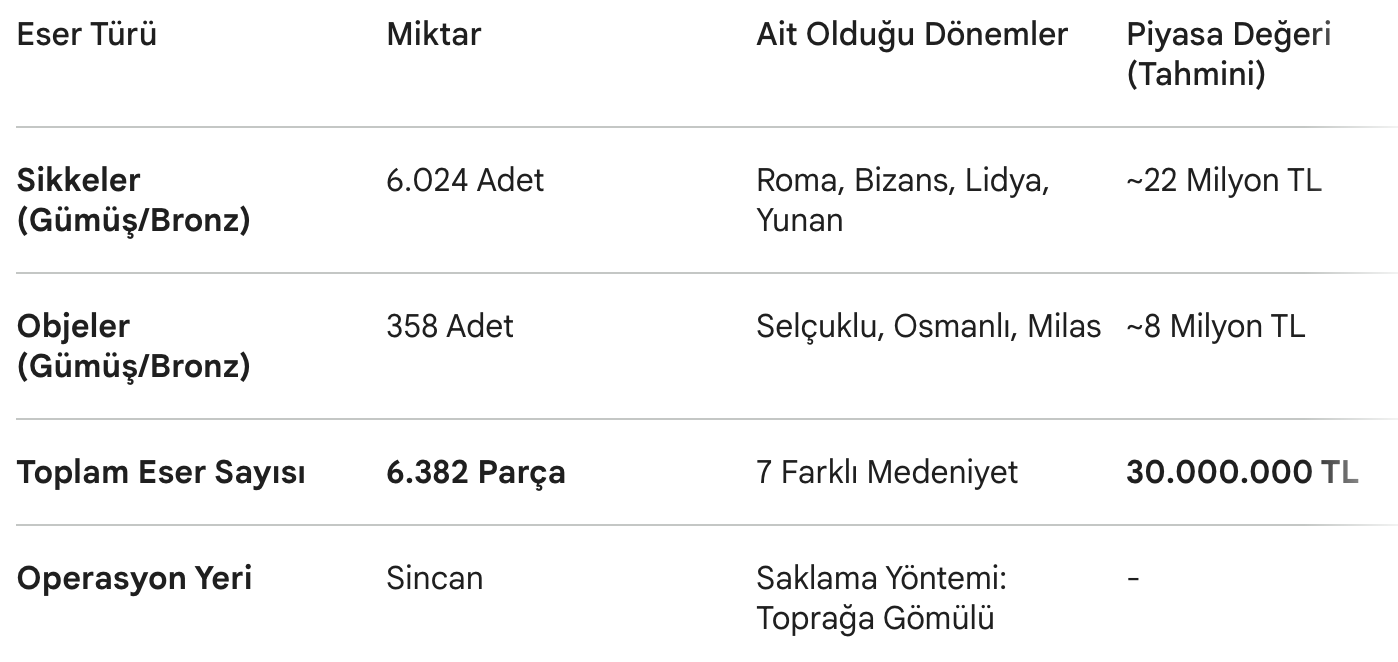 Operasyonda ele geçirilen 6 bin 382 parça eser, sadece sayısal büyüklüğüyle değil, niteliğiyle de dudak uçuklatıyor. Koruma altına alınan hazinede; 6 bin 24 gümüş ve bronz sikke, 358 adet paha biçilemez obje ve kazılarda kullanılan bir adet dedektör yer alıyor. Eserler, incelenmek ve sergilenmek üzere Anadolu Medeniyetleri Müzesi’ne teslim edildi.