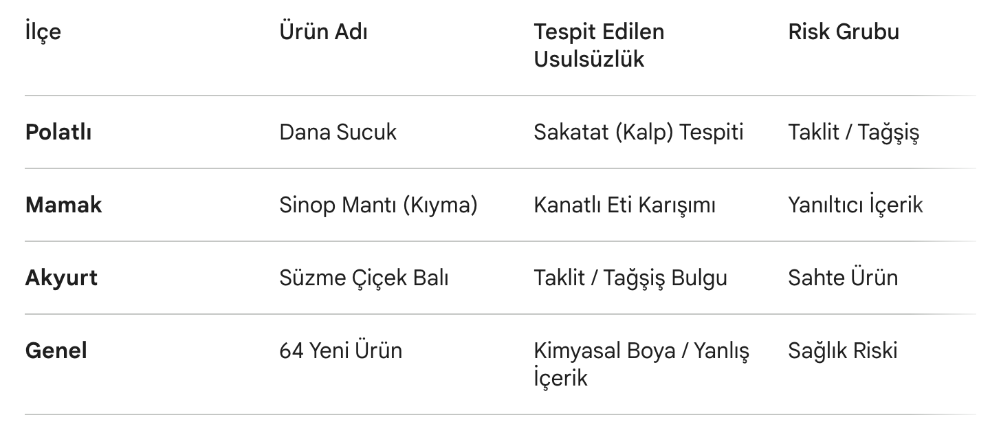 - Mamak: "Sinop Mantı (Dana Kıyma)" adıyla pazarlanan üründe, dana eti yerine kanatlı eti (tavuk/hindi) kullanıldığı saptandı.