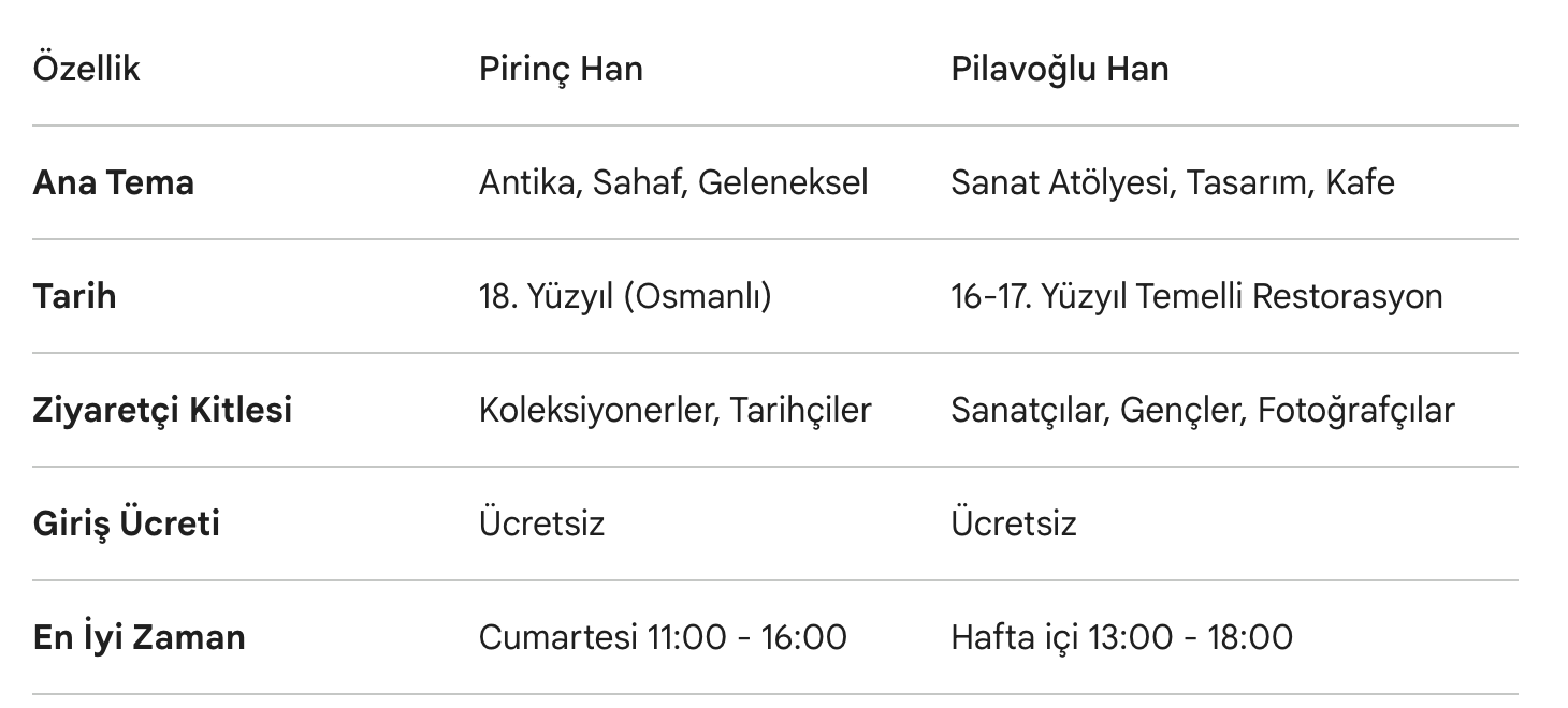 📊 Şehir Rehberi: Hanlar Karşılaştırma Tablosu